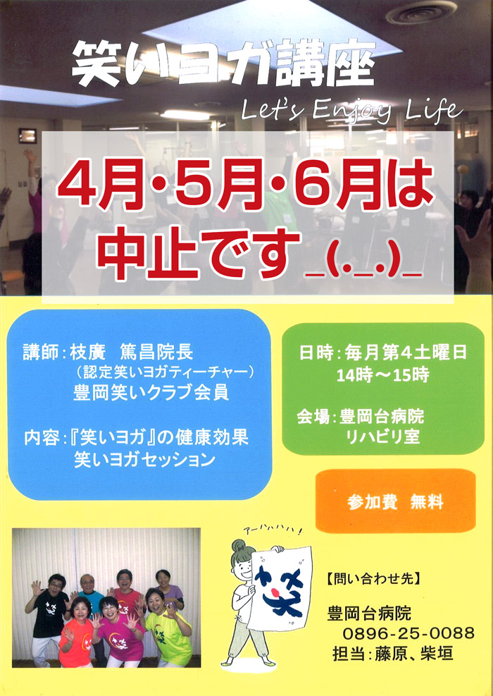新型コロナウイルスの感染拡大のため、大変残念ですが、4月・5月・6月の笑いヨガ講座は中止といたします。