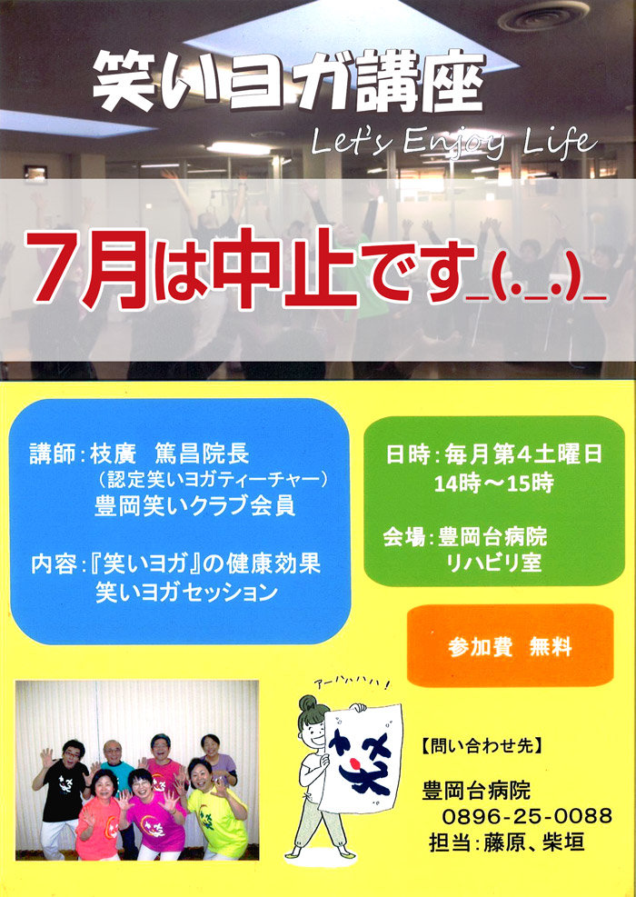 新型コロナウイルスの感染防止のため、大変残念ですが、7月25日の笑いヨガ講座は中止といたします。