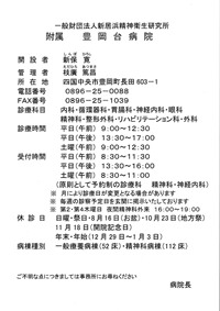 | 昭和58年11月 | 一般財団法人新居浜精神衛生研究所 附属 豊岡台病院開設 四国縦貫自動車道が敷地内を通ることなり、観音道病院をやむなく閉鎖し、豊岡地区に移築 |